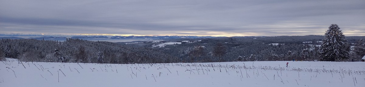 Dieses Jahr kommt der Winter früh. Schon lange ist es kalt, und nun hat es auch endlich geschneit. In den tieferen Lagen ist der Schnee schnell wieder geschmolzen, aber in den Höhenlagen Richtung Schwarzwald bleibt das funkelnde Weiß zum Glück liegen. Also packen wir heute endlich mal wieder unsere Schneeschuhe und fahren nach Höchenschwand. Auf 1.000 Metern ist es kalt genug, dass die Loipen gespurt und die Winterwanderwege freigegeben sind. Der Schnee verwandelt die gesamte Landschaft in ein weisses Wintermärchen. Und obwohl es bedeckt ist und die Sonne sich nicht hervorwagt, zeigen sich die schneebedeckten Gipfel der Alpen imposant mit nahezu 180°-Blick.
