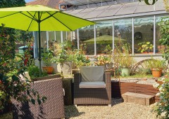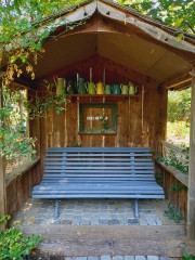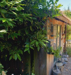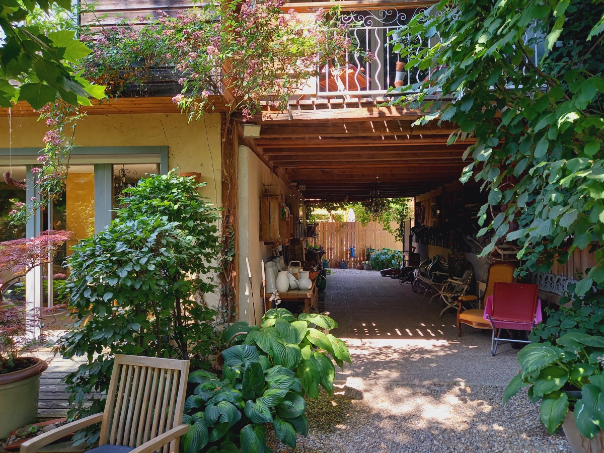 Vom Frühstückraum geht es über eine von vielen Blumentöpfen und rankenden Pflanzen geschmückte Terrasse in den verwunschenen Garten. Es gibt verschiedene kleine Oasen mit Sitzplätzen, ein Gartenhäuschen, einen offenen Wohnwagen und unzählige Bäume, Sträucher und Pflanzen. Jeden Tag kann man sich ein neues Plätzchen zum Verweilen aussuchen und den zwitschernden Vögeln lauschen. Einzig die zahlreichen und stechfreudigen Mücken sind ein Wermutstropfen.